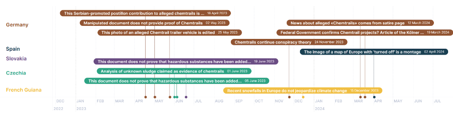 We also wanted to select only the debunked disinformation that contains the word chemtrails, and we discovered that only for the past year and a half, we have had the word mentioned in 11 false claims spread in four european countries: Germany, Spain, Slovakia, Czechia.